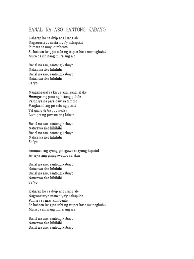 Verse Em7 C Kaharap ko sa dyip ang isang ale Em7 C Nagrorosaryo mata niyay nakapikit Em7 Pumara sa may kumbento C Sa babaan lang po sabi ng tsuper Em7 Kase may nanghuhule C Mura pa rin ng mura ang ale Chorus Em7 D C Banal na aso santong kabayo Em7 D C Natatawa ako hi hi hi hi Em7 D C Banal na aso santong kabayo Em7 D C Natatawa ako hi. Banal Na Aso Santong Ka Start a Free Trial to learn songs the new way. Sa babaan lang po sabi ng tsuper kase me naghuhuli.